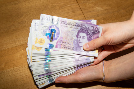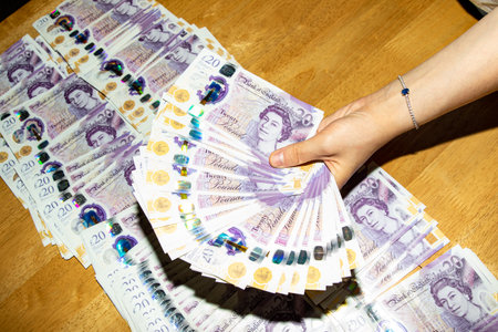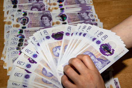 A hand holding a fan of twenty-pound banknotes, with stacks of more banknotes visible in the background. The notes feature a portrait of Queen Elizabeth II and are arranged neatly on a wooden surface.