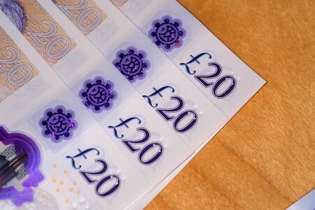 Close-up of 20 GBP notes on table. Cash, money, and finance concept for stock photography and financial illustrations.