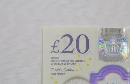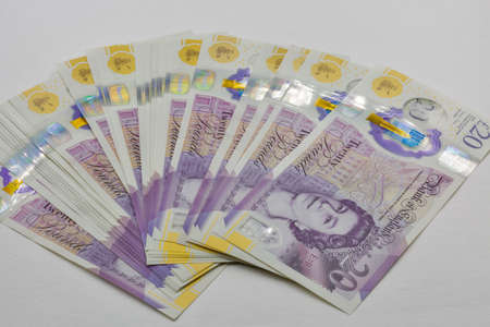 20 Sterling Pounds banknotes. Corner of the stack. New British polymer money. Macro photo.