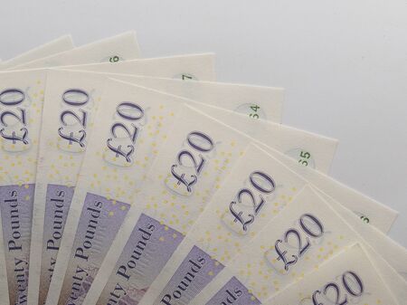 20 British pounds bills lies isolated on white background with copy space stacked in fan close up