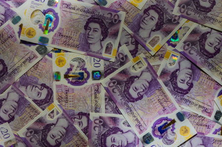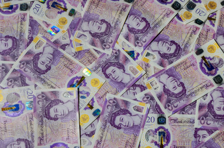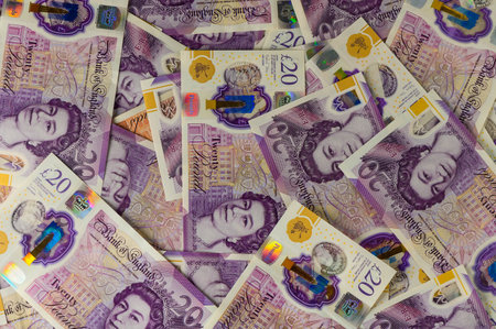 20 GBP currency notes randomly scattered on a table. Concept of cash, money, and finance for stock photography and financial illustrations.