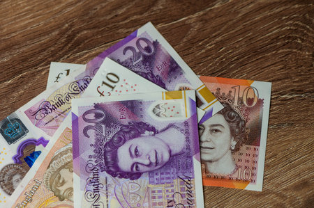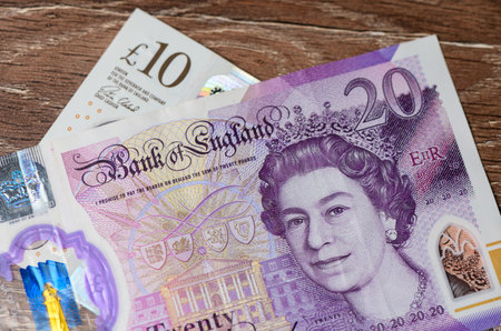 British ten and twenty pound sterling banknotes lying on a wooden table, close-up, concept of UK currency and finance.
