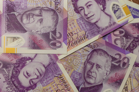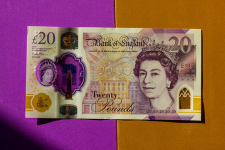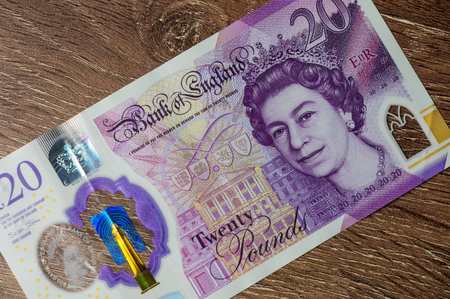 England, United Kingdom May 7 2023Twenty British pounds on violet brown background. 20 pounds. Money exchange. Paper banknote top view. Cash flatly. Savings, investments, keeping money in the bank.