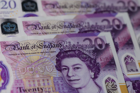 British twenty pounds sterling banknotes closeup. Portrait of Queen Elizabeth II.