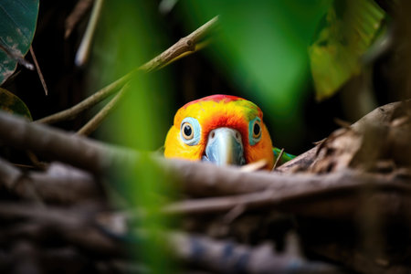 a colorful parrot peering through a gap in the forest leaves, created with generative ai