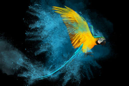 Colorful powder explosion with Macaw parrot flying isolated on black background.