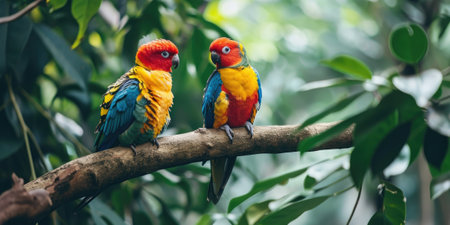 Two colorful parrots sit on a branch amidst lush jungle foliage, highlighting the beauty of tropical wildlife.