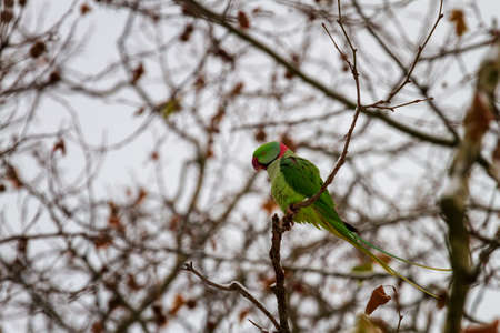 Rose-ringed parakeet, Green parrot on the branch in winter