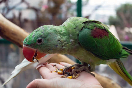 Female Alexandrine parakeet in the hand. Bird on the hand.