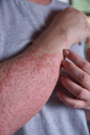 Adult male showing visible red rash and discomfort from eczema or allergic skin reaction on forearm, indicating skin condition.