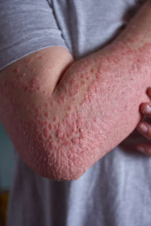 Acute psoriasis on the elbows is an autoimmune incurable dermatological skin disease. Large red, inflamed, flaky rash on the elbows. Joints affected by psoriatic arthritis