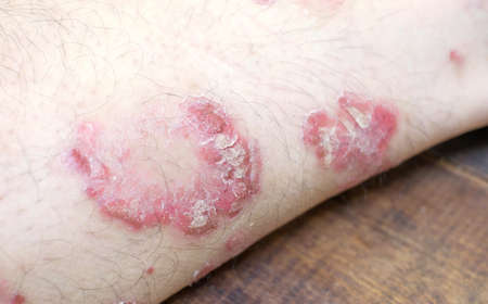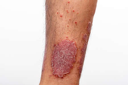 Close-up of the legs of a man suffering from chronic psoriasis on a white background