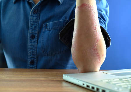 Male elbow and flaky skin and psoriasis