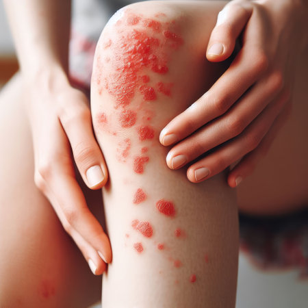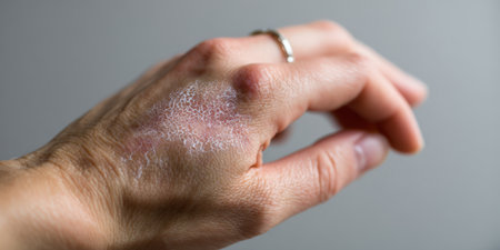 Eczema and psoriasis visible on hands of a person sitting outdoors in a calm setting