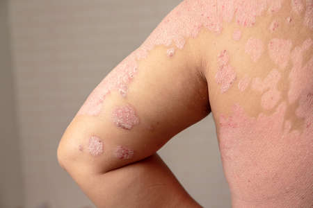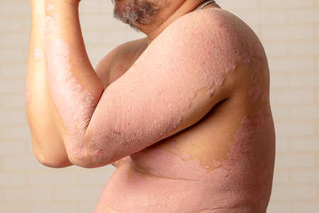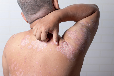 A man with psoriasis on his back and neck. Scratch with his hand. Psoriasis vulgaris