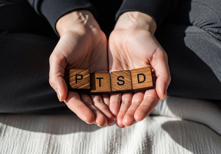 Cupped hands displaying wooden letter tiles spelling PTSD, symbolizing Post Traumatic Stress Disorder awareness, support, and mental health challenges or therapy.