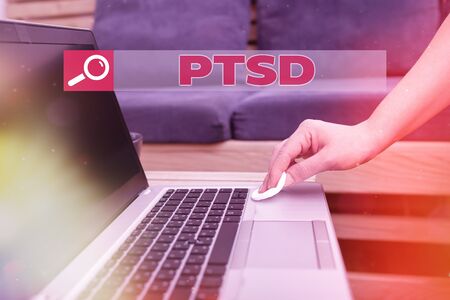 Hand writing sign Ptsd. Internet Concept Post Traumatic Stress Disorder Mental Illness Trauma Fear Depression Man Using Laptop And Girl Standing Sharing Ideas For Improvement.