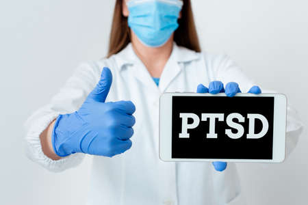 The doctor's blue - gloved hands show the word PTSD - . a gloved hand on a white background. medical concept. the medicine