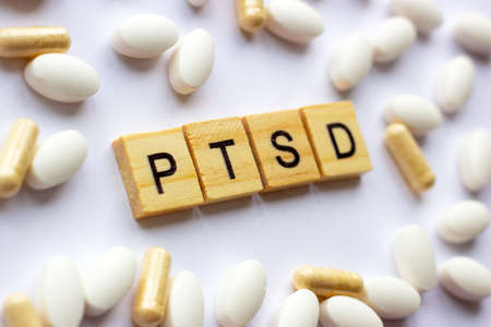 The medical phrase ptsd on different pills and capsules background. Pharmacy theme, health care, drug prescription for treatment medication and medicament.
