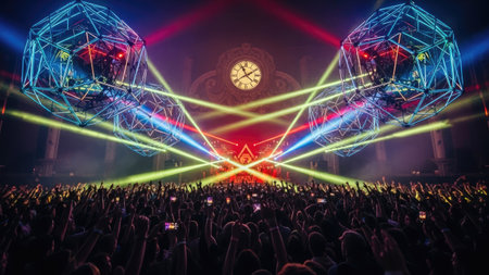 Stage lights and crowd of audience with hands raised at a music festival. Fans enjoying the party vibes.