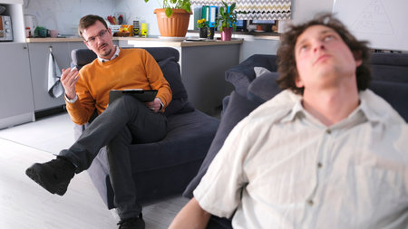A day in the life of a psychotherapist. The help of a psychologist in self-realization and self-search. The work of a psychoanalyst. Two men are sitting in the living room, one of them is holding a tablet in his hands. The scene is laid-back