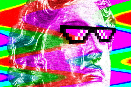 Collage with plaster antique sculpture of human face in a pop art style. Modern creative concept image with ancient statue head. Zine culture. Contemporary art poster. Funky minimalism. Rainbow.