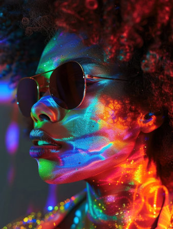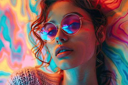 Psychedelic Portrait of Woman with Colorful Neon Lights and Trendy Sunglasses