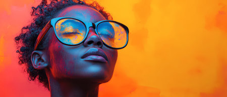 A young woman with curly hair wears oversized sunglasses, gazing calmly. The vivid orange and blue backdrop creates a striking contrast, adding energy to the moment and emphasizing her expression.