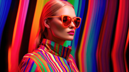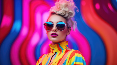 Chic woman with oversized futuristic glasses against a swirling neon backdrop, embodying a vibrant and edgy aesthetic. The ultimate modern fashion statement. Generated A.I.