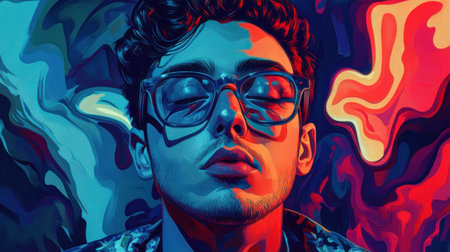 portrait of a man in hypnosis, colorful abstract world of illusion