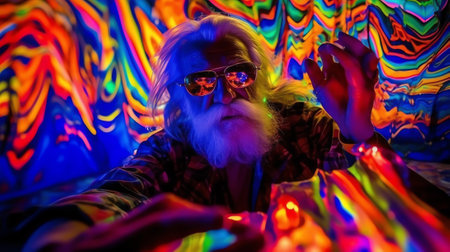 The man with long hair and a beard is standing in front of colorful lights, AI