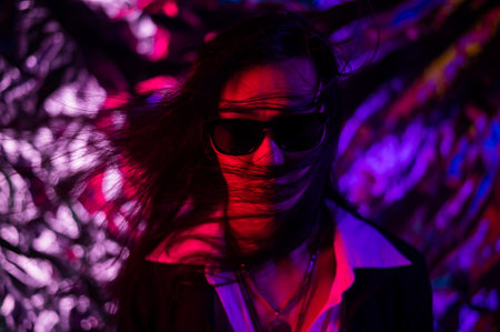 Portrait of a transgender model in sunglasses in a studio with neon lighting.