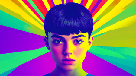 Colorful portrait of a young person with a vibrant, psychedelic background of rays, creating a surreal and pop art-inspired aesthetic.