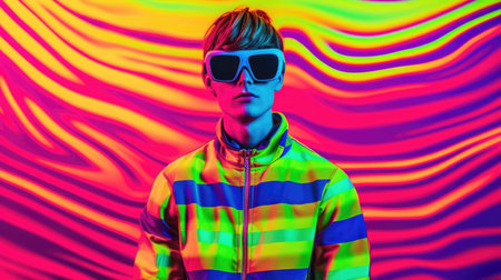 A young man poses confidently in colorful goggles, surrounded by bright shades of pink and blue light.