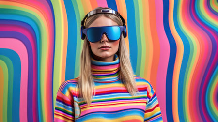 Young female model wearing VR posing with trendy fashion outfit and colorful red optical art abstract background. Picturesque generative AI