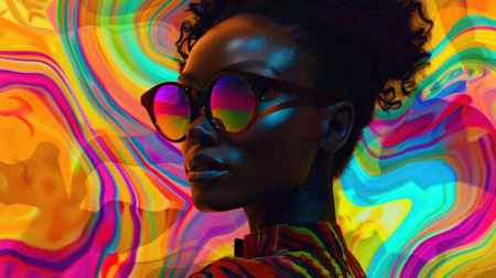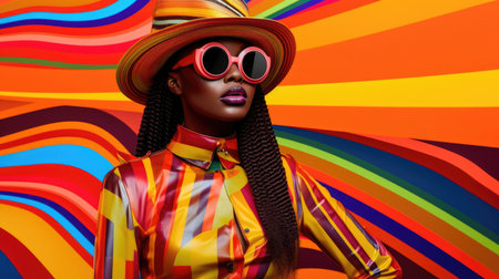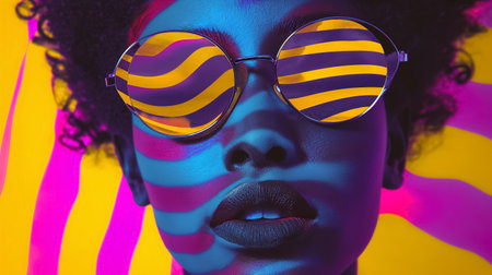 Portrait of retro black woman in sunglasses and vivid jacket with visual distortion effect on background, striking portrait with bold colors stripes and waves in pop art style, AI