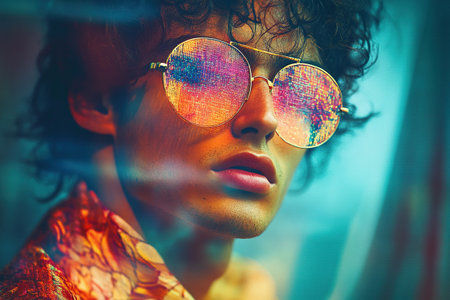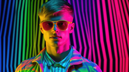 Vibrant Portrait of Young Man with Colorful Light Reflections
