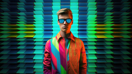 Young male model posing with trendy man fashion outfit and colorful vibrant glowing green and pink optical art abstract background. Picturesque generative AI