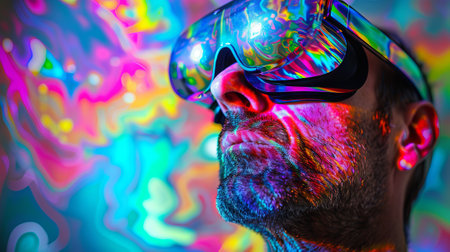 Caucasian bearded man with VR headset surrounded by colorful abstract lights. Concept of virtual reality, technology, digital experience, futuristic innovation.
