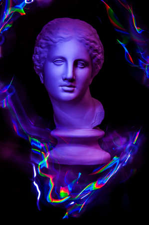 Statue of Venus de Milo. Creative concept colorful neon image with ancient greek sculpture Venus or Aphrodite head. Webpunk, vaporwave and surreal art style.