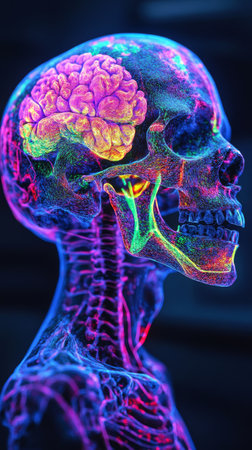 Vivid neon art highlights the brain's structure with creative depictions of scientific ideas.