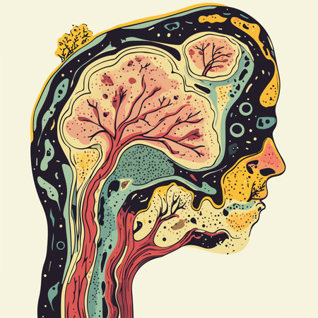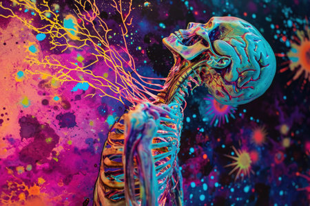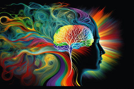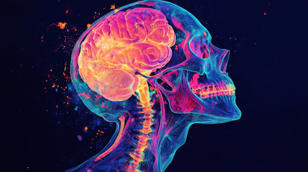 This artwork features a detailed brain against a colorful, abstract background depicting neural patterns.