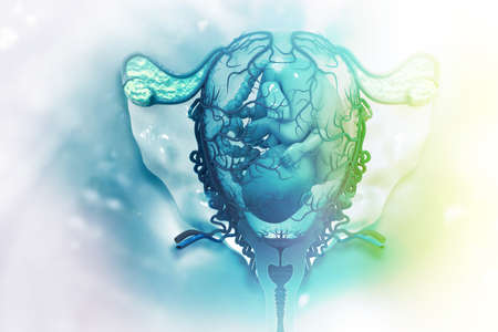 Digital illustration of human skeleton in blue and red lights. 3D rendering