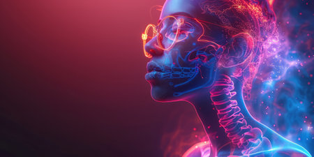 Anatomical mock-up of a human head in purple-pink gradient and digital grid.