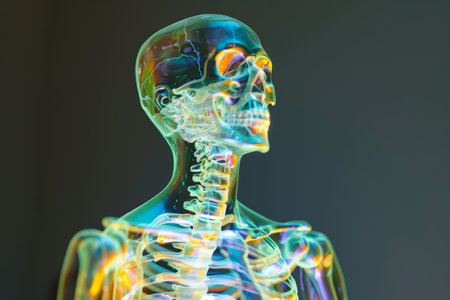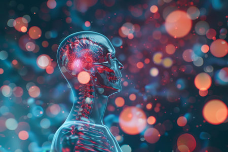 3d visualization of neck pain in human anatomy with highlighted spine and blue bokeh background