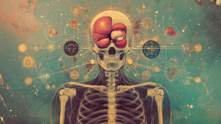 Cross-section sci-fi fantasy human organ. techno-advanced organs perform functions beyond capabilities of human organs, such as providing enhanced physical abilities or synthesizing chemical elements.