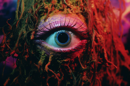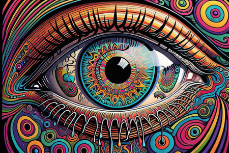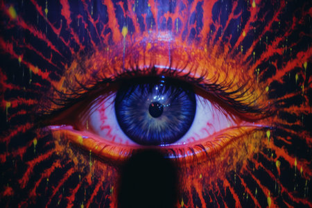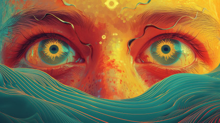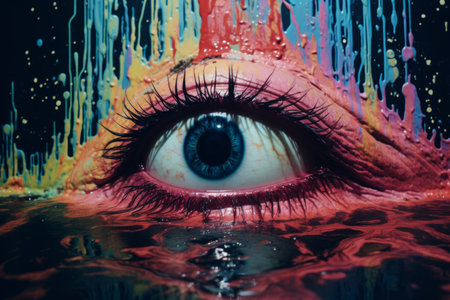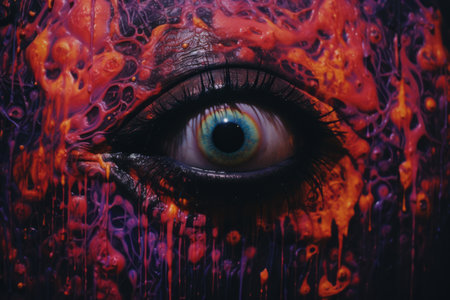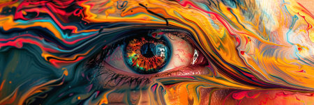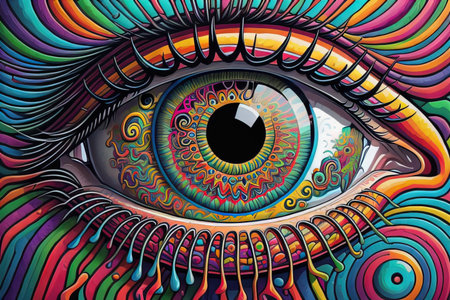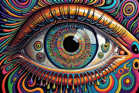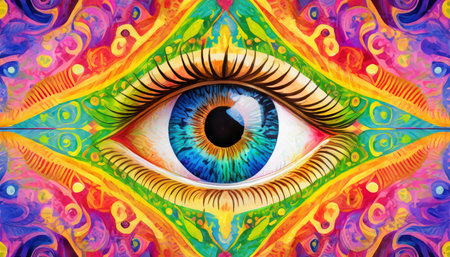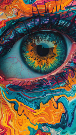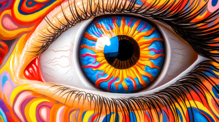 This vibrant close up captures a painted human eye, showcasing an intricate design with a colorful iris resembling a radiant sun, symbolizing insightful observation and artistic expression