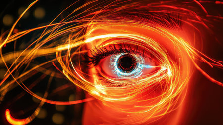 This striking close-up image showcases a human eye surrounded by vibrant light trails, creating a surreal and futuristic aesthetic that captivates the viewer's imagination.
