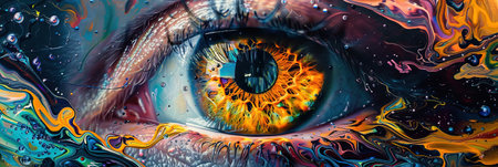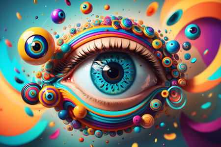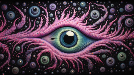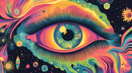 Vibrant cosmic eye illustration displaying colorful patterns and celestial elements against a dark background