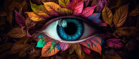 Vibrant close-up of an eye surrounded by colorful abstract patterns, showcasing the beauty of art and nature in vivid detail.